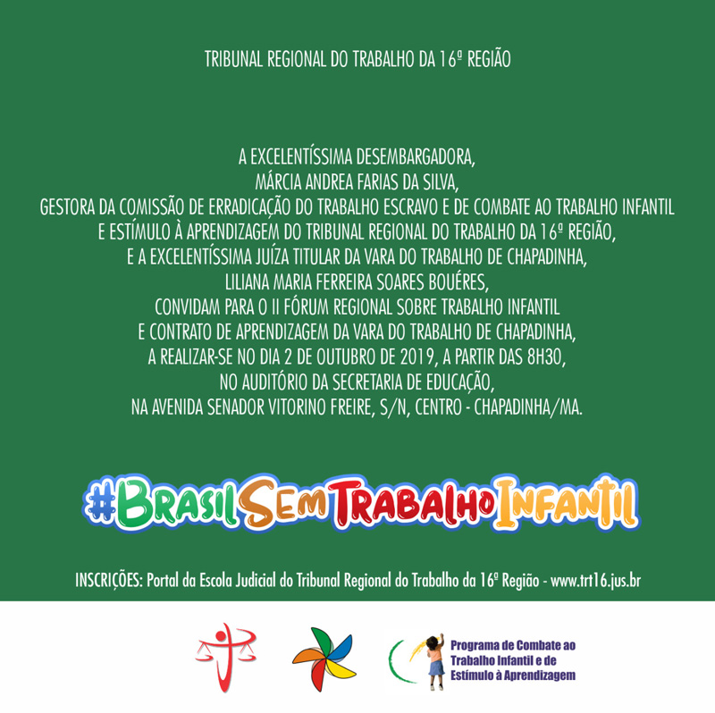 O Fórum é promovido pela Comissão Regional de Combate ao Trabalho Infantil e de Estímulo à Aprendizagem do Tribunal Regional do Trabalho da 16ª Região (TRT-MA) e conta com a parceria da Vara do Trabalho de Chapadinha e de outros órgãos públicos.